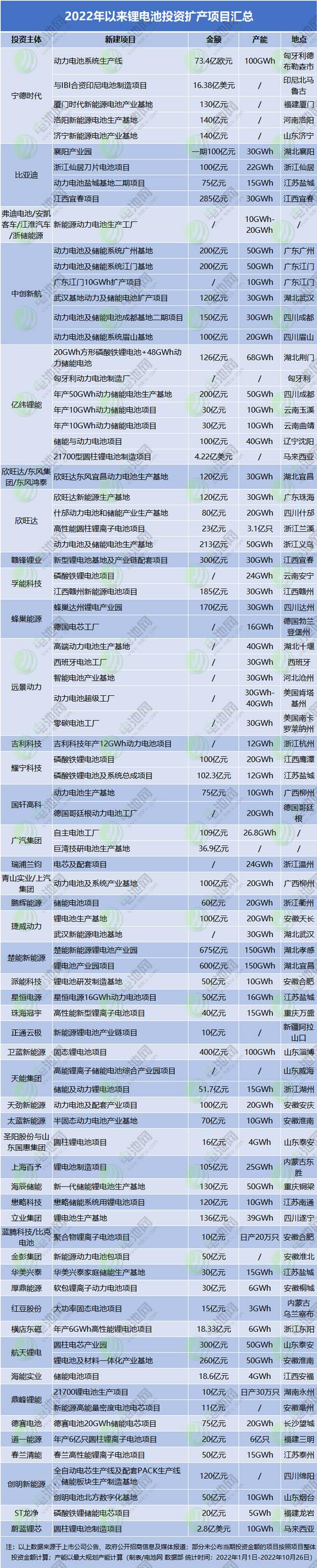 12月1日電池網公(gōng)布的數據顯示(shi),據不完全統計(ji),2022年以來,僅在🔞锂(li)電👨❤️👨池生産制造(zào)領域,新公布的(de)投資擴産項目(mù)就多達84個,其中(zhōng)🔴有69個公布投資(zi)金額,總金額超(chao)8427億元,平均單個(gè)項目投資額超(chāo)122億元;公🛀布年産(chan)能的項目有68個(gè),總産能約2038GWh。